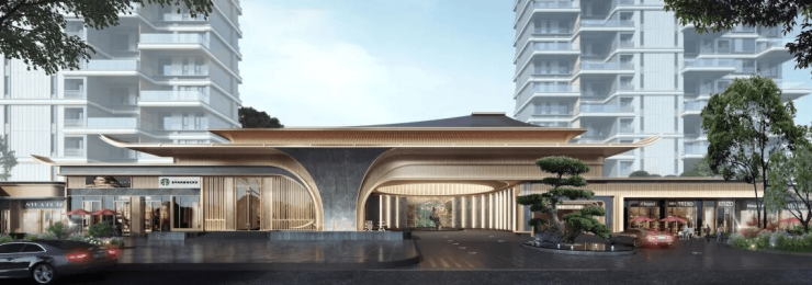 【龙岩门面】约70米超尺度创新诗意东方大门,金边御道、宽顶长檐、飞檐翘角与香槟色金属门框细节彰显精致优雅,尽显高门阔府的恢弘气势。