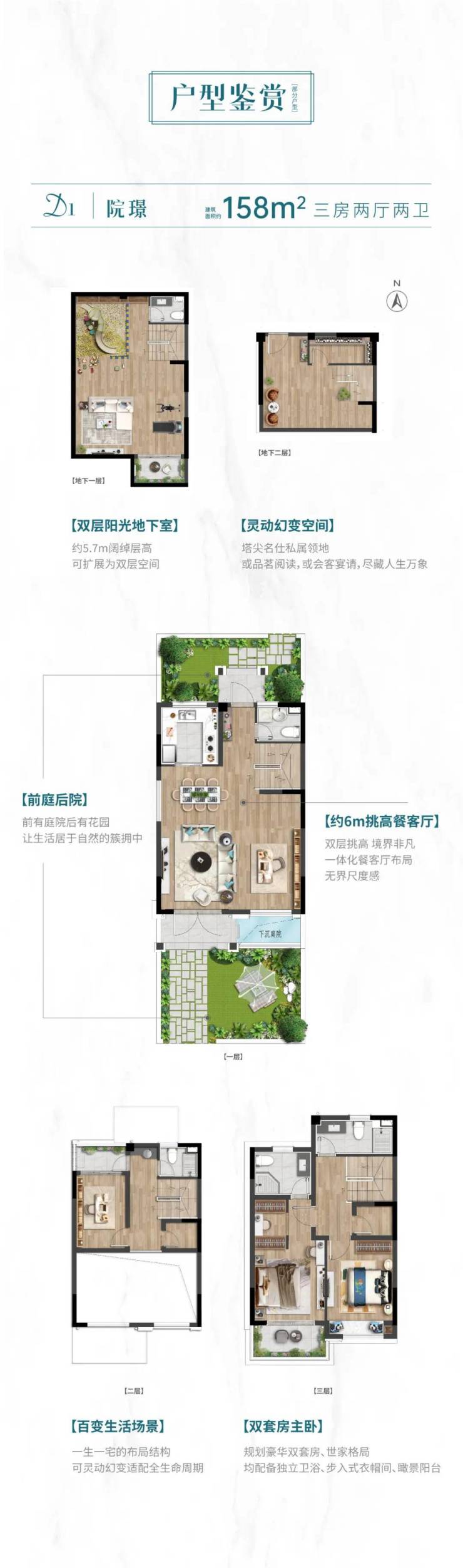 建面约150-160㎡别墅,规划3F联排别墅+5F臻品叠墅产品,院落墅居、星级套房、地下室等满足都市家庭对于墅居的所有美好想象。