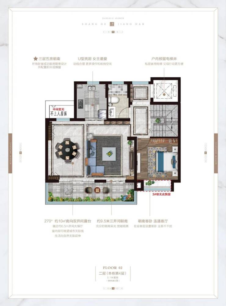 该边套观景户型进门是独立的入户玄关,私密性好,阔绰客餐厅,约3.2米观景飘窗,超广视角,两间卧室朝南,其中一间卧室还自带阳台。