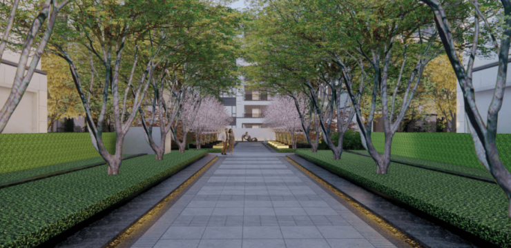 西门入口增设特色水景景观,都说“遇水聚财”,寓意很讨巧。东西横向中轴,选用5至6米高的樱花树,全冠移植,打造凤屿山河的樱花大道,未来业主不用去鼋头渚,也能一赏春色如许。