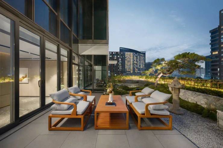室内还有更精妙之处。潮上中南银座的每套房源,都设计了一条7米多长、3米宽的室内艺术廊道。加藤精心挑选棕竹、铁线蕨,规置手水钵、石灯笼和苔山。