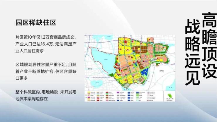 片区内近10年仅1.2万套商品房成交,产业人口已达16.4万,无法满足产业人口居住需求,区域规划居住容量严重不足,随着产业不断落地扩容,住区容量缺口更多,整个科教区内,宅地稀缺未开发宅地仅本案周边存在