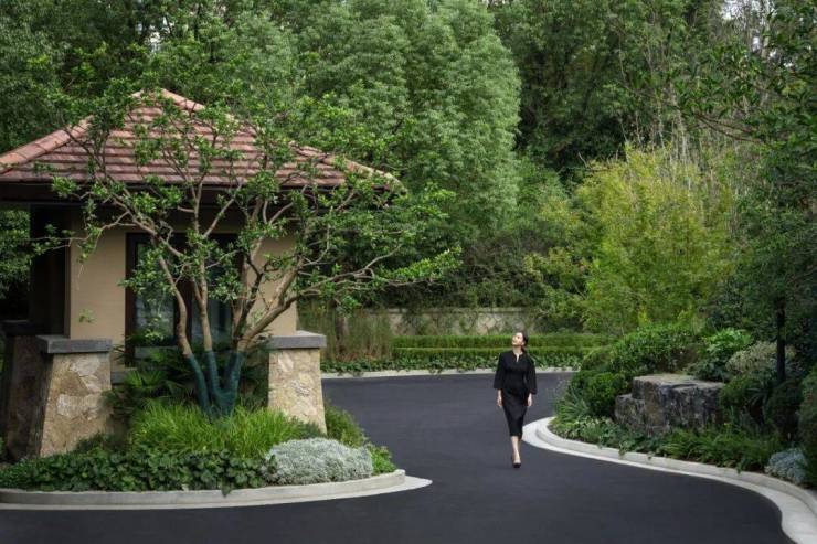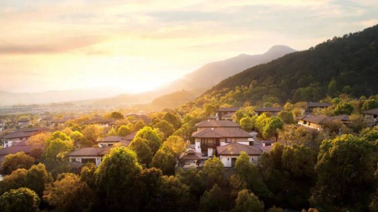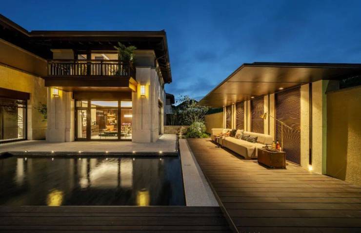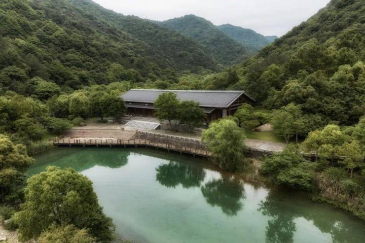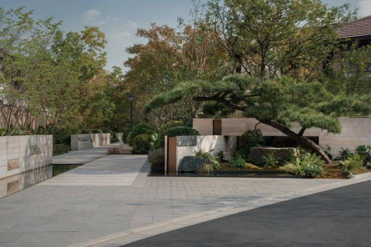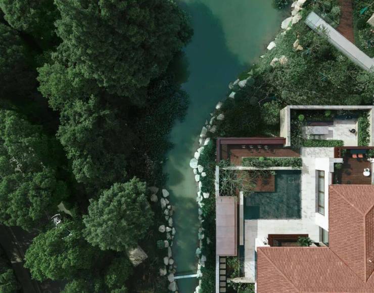万科·公望整个地块峰峦叠嶂,上百年的古树随处可见,又因着地块有着上百米的天然高差,以致溪流经年不断,就着溪涧,涓涓潺潺,一种王维式的禅意山水跃然纸上。至于屋舍,藏于茂密植被的缝隙间,隐约可见。