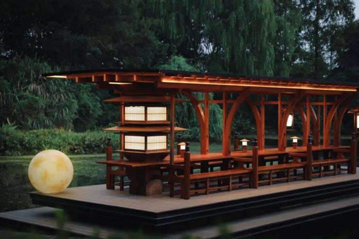 所有活动中,最为破圈的,当属与中国美院建筑造园王欣教授达成共识,于湖山间,共创了宋风画舫。轻歌曼舞间,重现1000多年前的私宴雅集。
