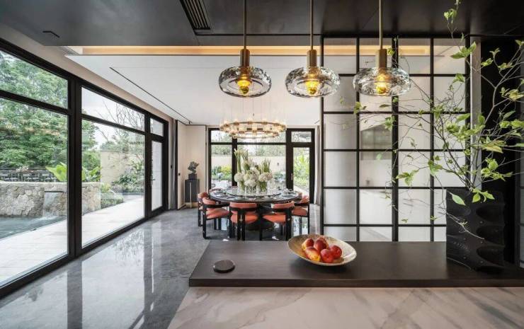 合院精工交付,室外石材上墙,高及胸口,古朴厚重;室内大理石铺装,玄关处水刀拼花,背景墙鱼肚金覆盖,细节、诚意一个不少。