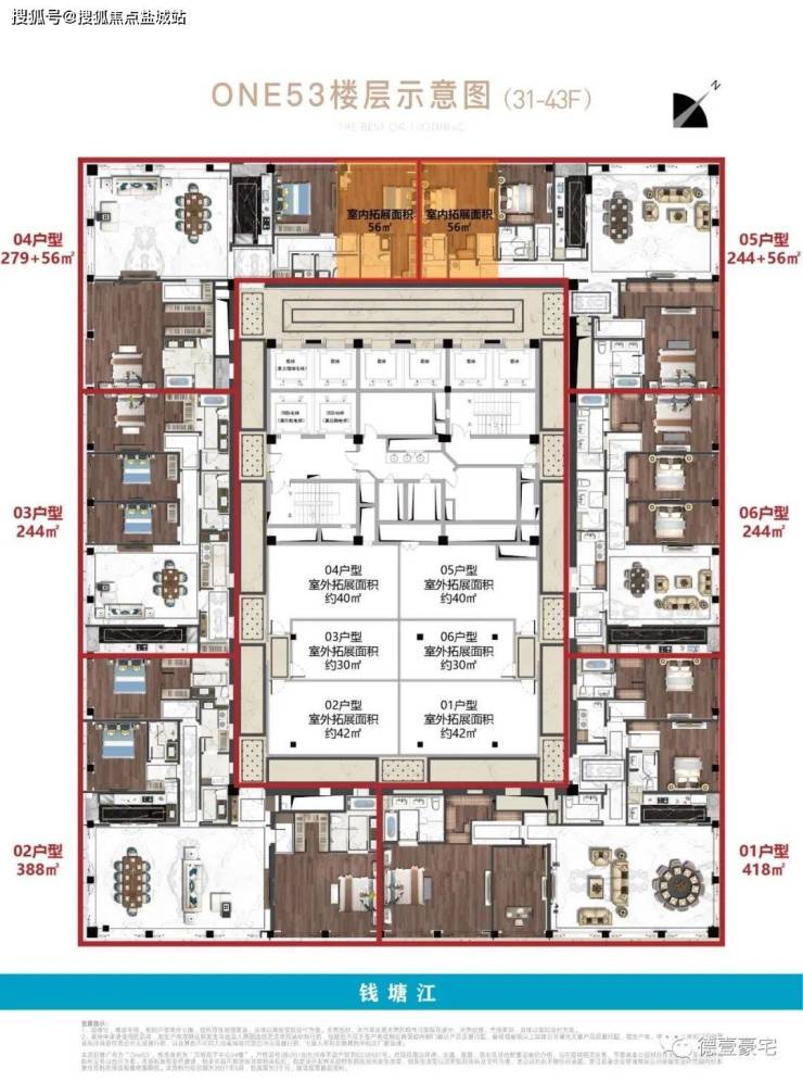 稀缺江景资源:主力户型244-438㎡,高区单元可270°瞰江,部分房源直面奥体“莲花碗”灯光秀