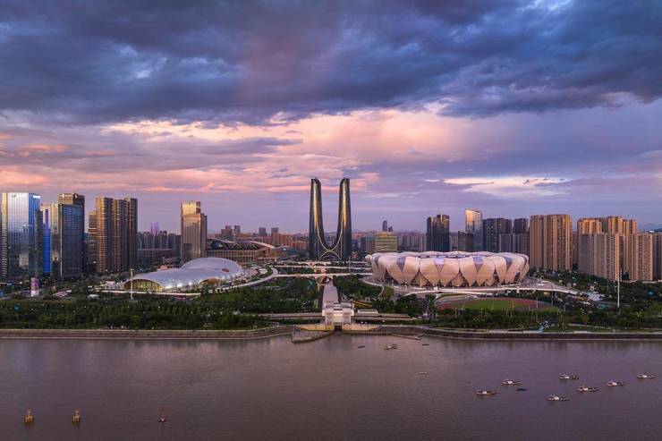 SOM设计的杭州世纪中心(杭州之门)项目位于萧山区钱塘江东岸的钱江世纪城核心板块,东至杭州国际博览中心,西至综合训练馆,毗邻亚运会主场馆杭州奥体中心“大莲花”。双塔朝向远处的钱塘江和利民河,从江南大道眺望,杭州世纪中心是通往市中心的重要门户。