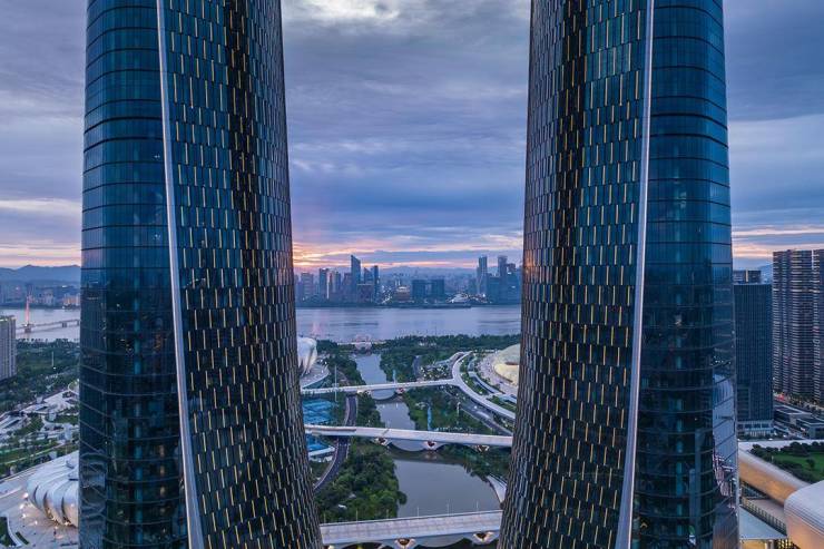SOM在设计理念上结合杭州文化的城市之形、拱桥之意、园林之神,打造出以杭州拼音首字母“H”为蓝本的建筑造型,双塔羽翼设计寓意城市的展翅飞翔,与江对岸钱江新城的“日月同辉”建筑遥相呼应。
