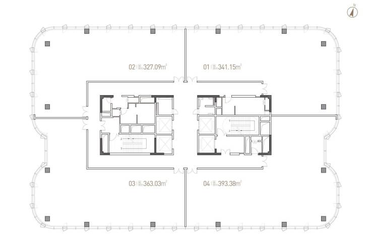标准层分割面积:建筑面积约327㎡-约341㎡-约363㎡-约393㎡