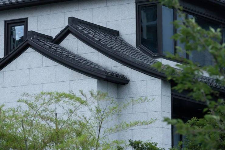 立面不是传统中式的白色涂料,而是采用火烧水洗面石材。每块石材用20000K火焰喷烧,再经高压水洗,营造出细腻的质感。