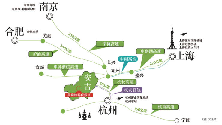 项目位于环杭一线圈层、环沪二级圈层内,距离杭州约70公里,上海约220公里;约半小时杭州都市圈,10分钟县城区,迅捷通达,借商合杭高铁通车及未来双河产业园规划之势(未来宁杭二通道开通,即将开启20分钟到杭城,距项目仅10分钟车程),辐射县城区及景区,到时必然人流荟萃。