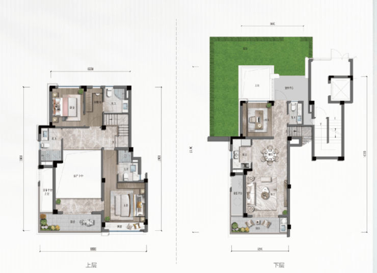 ·现代叠墅:“双首层”设计,首层层高约3.5米;户户有院、层层有园,大面积可拓展空间