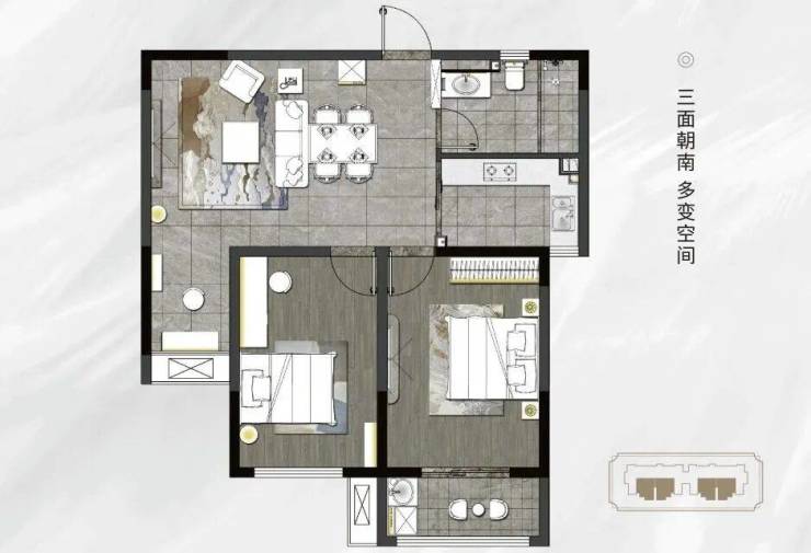 F2户型建面约85㎡两室两厅一卫,户型布局方正,动静分区。三面朝南,多功能空间、次卧、主卧采光上佳,约3.5米宽观景阳台,揽四季芳华。