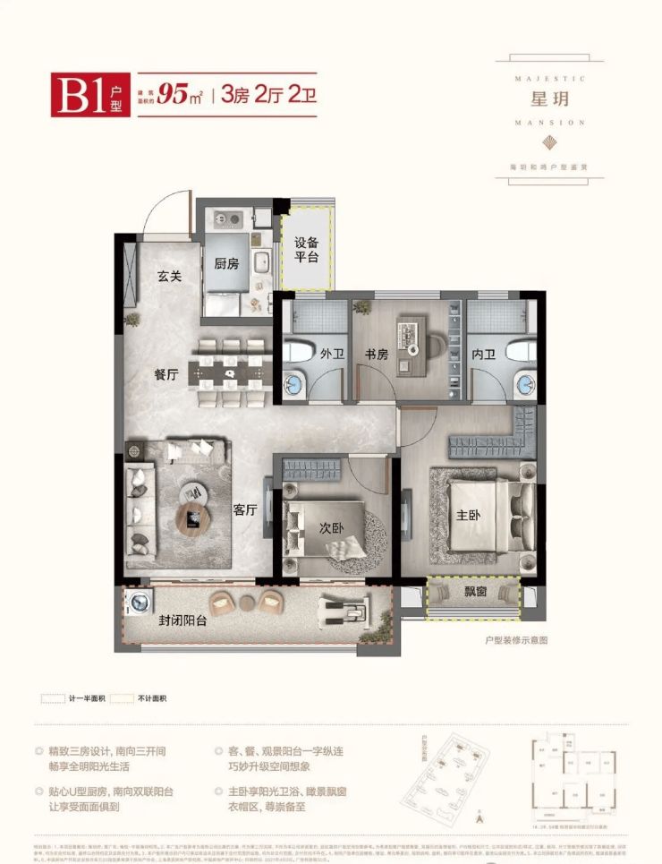 高层 B1户型 建筑面积约95㎡ 3房2厅2卫