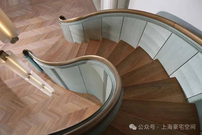 室内的旋转楼梯,木材选自东南亚柚木,现场效果相当惊艳。