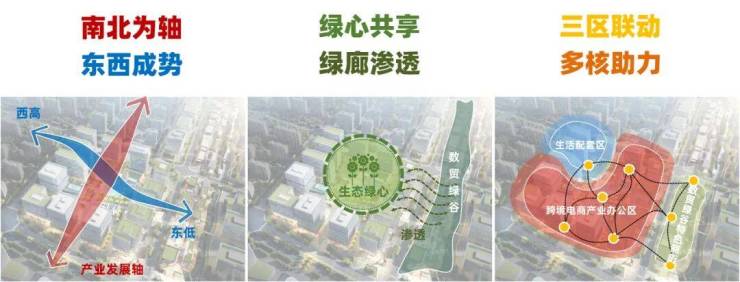 “我们不想做一个孤立的产业园,而是要打造一座‘微型城市’。” 项目设计团队负责人表示,设计之初便以“十字结构”为核心骨架,构建“南北为轴、东西成势”的整体布局——以中央“生态绿‘芯’”为基底,串联起跨境电商产业办公区、生活配套区、数贸绿谷特色商业区三大功能片区,实现“三区联动、多核辐射”。