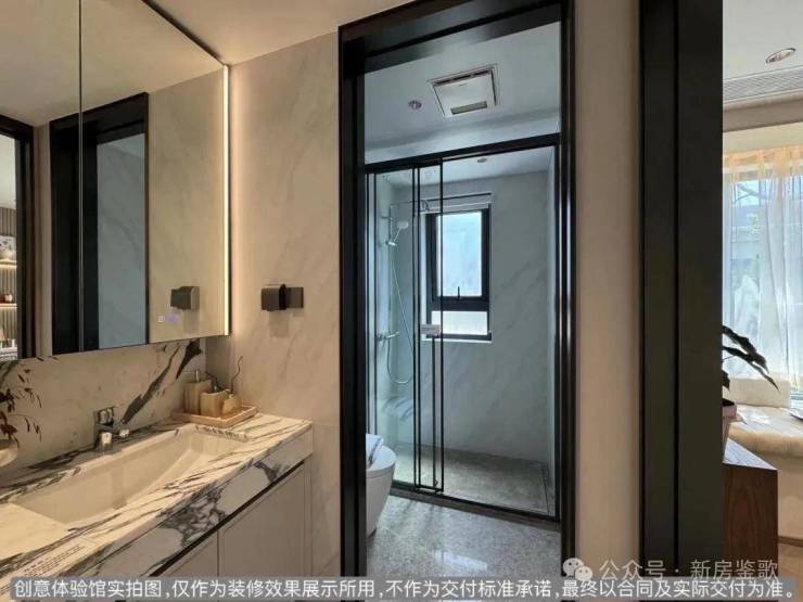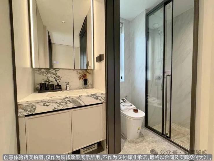 卫生间镜柜带有除雾功能,内置插座、吹风机架以及美妆冰箱(主卫);三段式移门有效放大了淋浴间的进出空间,小户型也能生活得更从容。