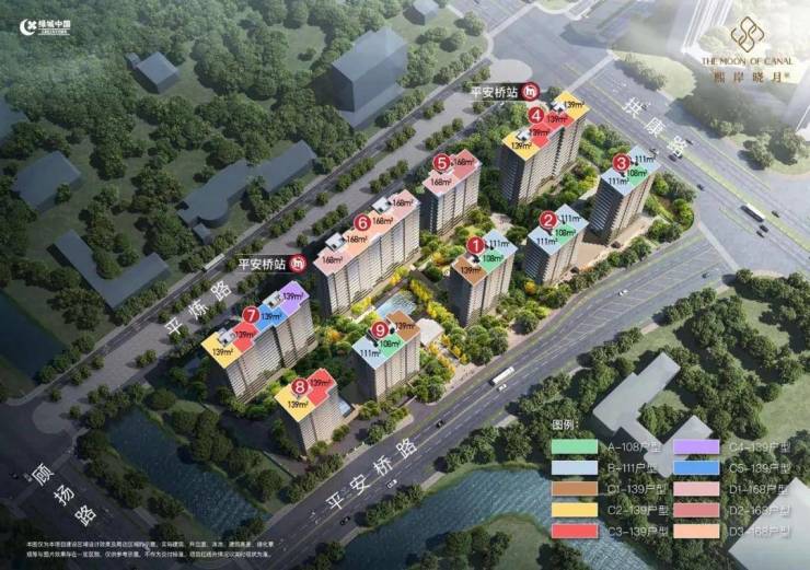 面积约108、111㎡2梯3户的3房2卫户型,139㎡(2梯2户、2梯3户)的4房2卫户型,168㎡(2梯2户)的4房3卫户型;