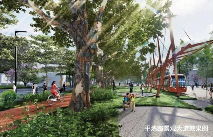 平炼路景观大道城北中央景观大道核心段,含观光有轨电车道、网红玻璃栈道、法国梧桐树阵列等景观内容,将被打造为杭州极具观赏性的景观大道;