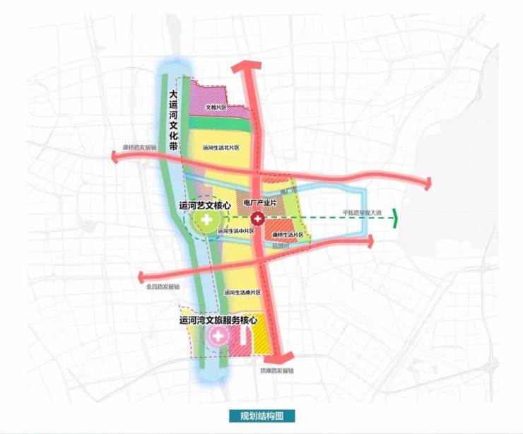 两心:即运河艺文核心、运河湾文旅服务核心。