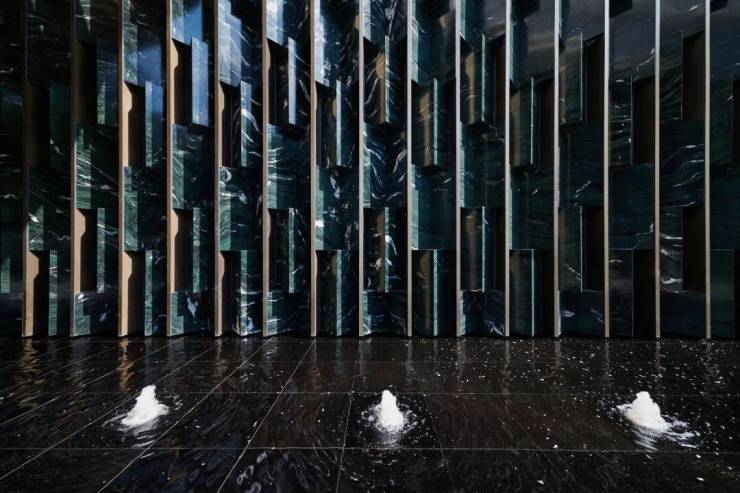 门庭巨幅奢石景墙,与光影交织,尽显奢雅。并且它还不是普通奢石,它的等级更高。每一块「百达翡绿」都是精挑细选,几何的构建、才有了现在如翡翠肌理的立体效果,这是普通石材铺装完全不能比拟的。