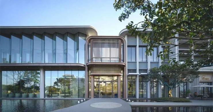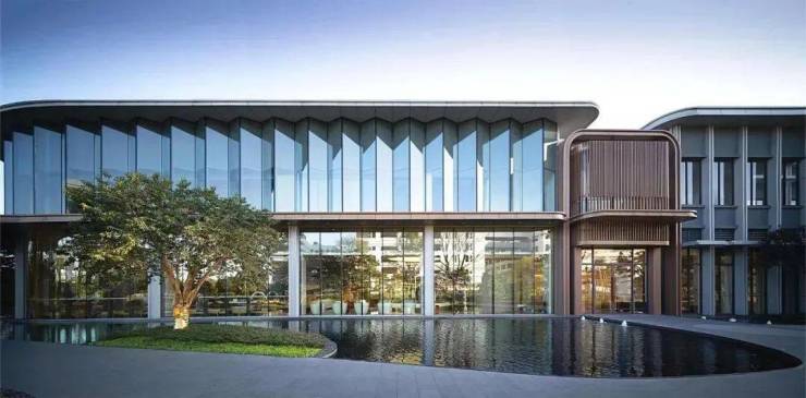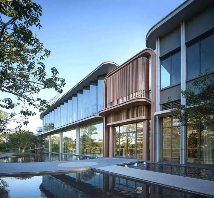 建筑主体强调结构与形式的统一,设计干净纯粹,以简洁的体块和线条为主要元素。立面虚实交织而延续,曲线金属予了轻盈流畅的弧形美感。采用纯粹体块搭配大面的通透玻璃,视野穿透,使室内外空间相互交融,形成一个有机的整体。