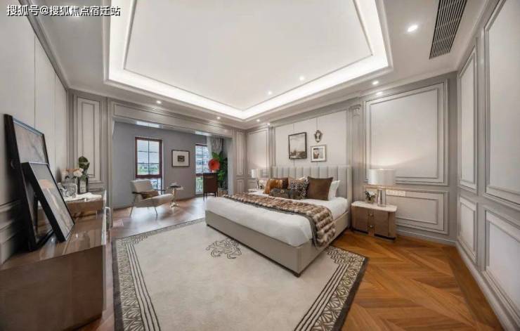 整个园区,以经典的绿城法式墅区景观大中轴贯穿,占地约1000多㎡,联排建筑的设计,融合了中国传统院落布局与法国枫丹白露宫的审美,外立面大面积采用全石材干挂,檐口等细节部位使用仿石。