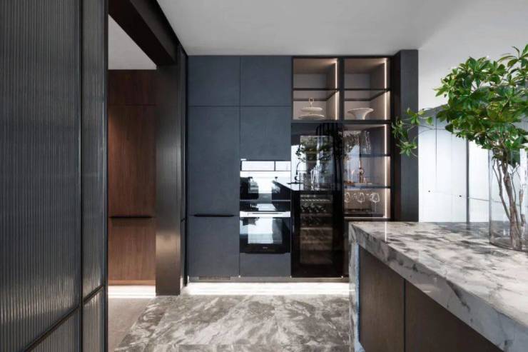 德国柏丽nobilia整体厨房,烤漆门板的选型为杭州壹号院量身定制,仿岩板色与深色木纹的搭配相得益彰,并加上柏丽的深色玻璃吊柜。定制设计中西双厨或开放式的社交厨房。巧思的细节设计,不论家庭互动还是会客聚友,都可以增加互动,社交无阻。