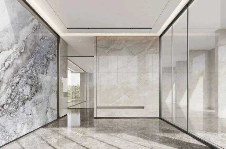 约2000吨天然“珍珠蓝”石材搭配玻璃幕墙、全落地系统窗封闭阳台、高级灰铝板、保温一体板构造国际化公建立面,横显竖隐秩序,以现代都会建筑勾勒城市天际韵律。