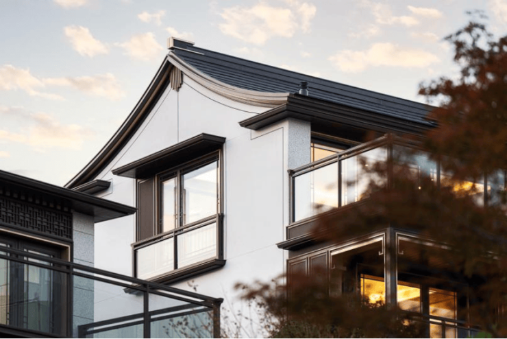 新中式,院墅,中式的坡屋顶与通透的大玻璃立面结合,将东方的传统意境与国际化的审美融合,像极了当前的杭州也像极了此刻的龙坞,既老又新,既传统又现代,既有西子湖的温婉又有钱塘江的磅礴,碰撞出一种全新的审美与生活方式。溪映听庐隆起的屋脊,仿佛群山的绵延,大地与人文交织出全新的风景。
