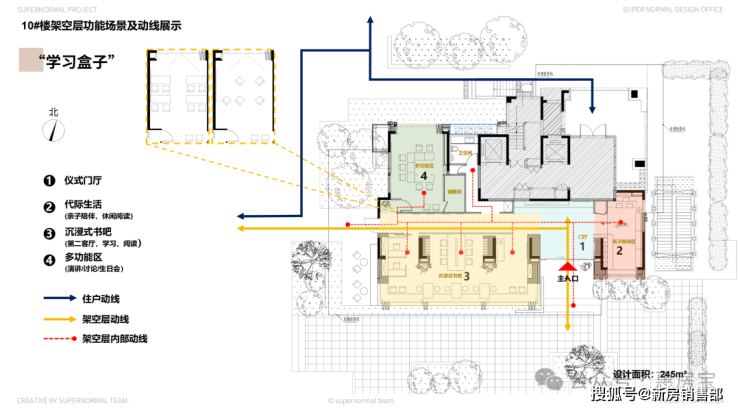 社区配套上,整个社区约3500方生活配套沿河而设,有意引入以下生活配套业态:咖啡简餐、便利店、水果店、早餐店、生鲜零售、健身瑜伽、洗衣店、药店等。在“边界消融”中,主动引导业主参与街区生活。同时,“屋檐之下,自然之家”的概念将架空层打造成“家外之家”的生活延伸,实现生活与自然的无缝衔接。还在社区10号楼和4号楼下,建立了户内户外联合,人与人情感链接的“阳光会所”。
