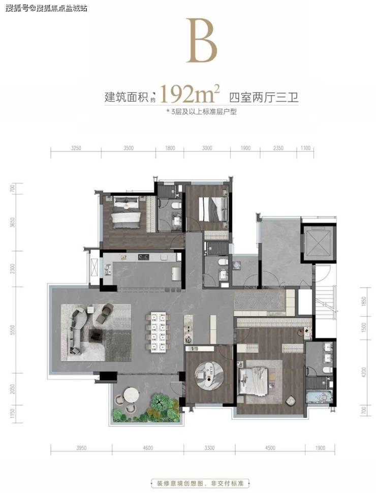 11栋共计15个单元住宅,505户全部2T2户;建面约143㎡、192㎡、238㎡,层高约3.15米。