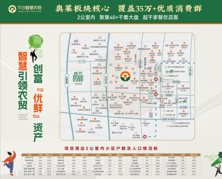 📍农贸市场一般的辐射范围在2-3公里,本项目2公里范围内小区有将近50个,常驻人口高达40万左右,庞大的农贸消费群足以支撑我们这个农贸市场的运营。