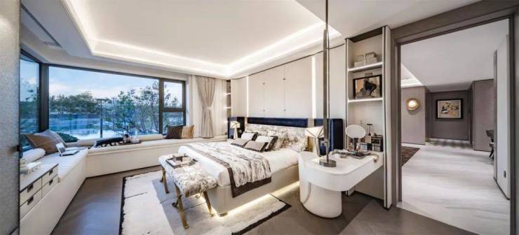 其中端户主卧设置的转角飘窗,采用无立柱设计,提供了270°无遮挡观景视野,形成了约6米长的沙发式转角飘窗。