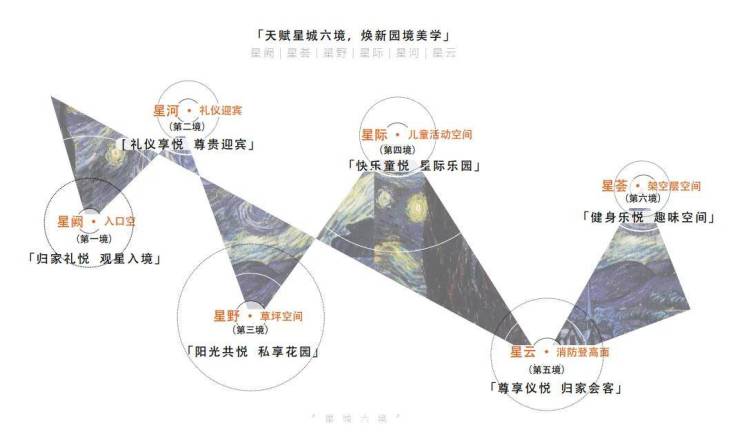 项目以现代手法结合传统精髓的创新设计与纯净的星空相互融合, 将建筑、文化、艺术与景观完美交融,筑造纯粹的意境空间。项目是由笛东执笔,筑造出[ 星阙 ][ 星荟 ][ 星野 ][ 星际 ][ 星云 ][ 星河 ] 六大盛境,营造中央景观 “景阔似海、品如繁星”的高品质人居环境;
