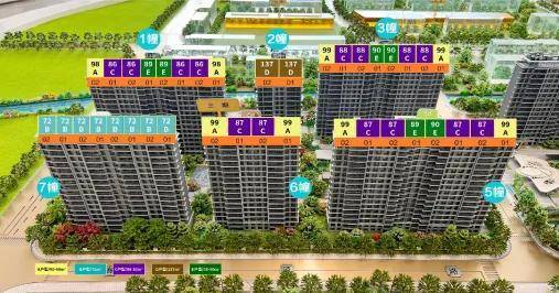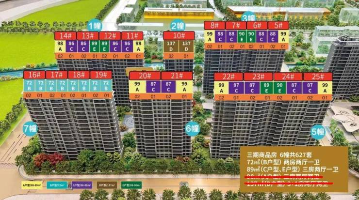 这里是我们即将推售的三期项目的沙盘,项目南至振泾路,东至徐安路,北至徐孝路,西至明珠路;小区占地面积23861.50㎡,建筑面积54881.45 ㎡,容积率2.3,绿化率35%,总户数627户;(70-88-98-130组成;70㎡共136套、88㎡C共230套、88㎡E共98套、98㎡共133套、130㎡共30套),是由5栋17层高层和1栋16层高层组成;小区主入口位于东侧徐安路,次入口位于韩家宅路。70㎡户型分布在7#楼;1#楼3#楼5#楼标准层中间套是C户型和E户型约88㎡三房两厅一卫,6#中间户是C户型约88㎡三房两厅一卫;两梯四户设计,得房率(1号,3号,5号得房率约78%;6号楼得房率约77%,7号楼得房率约72%;2号楼率约74%)其中2#楼底层部分做了架空层,用做于于业主休闲空间,全系带装修交付。预计交房时间为2024年年中,具体按照购房合同时间交付;小区采用人车分流设计,车位配比为1:1,地下613个车位;地上24个临时停车位,车位充足。