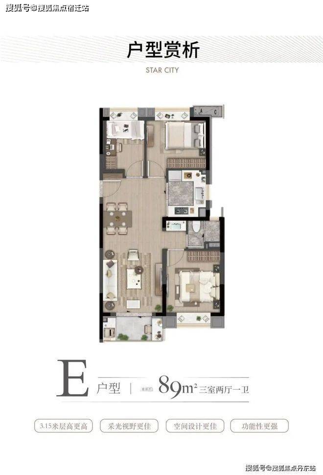 约89㎡户型:大虹桥范围不到90㎡的户型大部分都只做到2房,灿耀星城该面积段实现3房功能性,让自住客户一步到位,也让该产品进入二手市场后具备降维打击的优势!