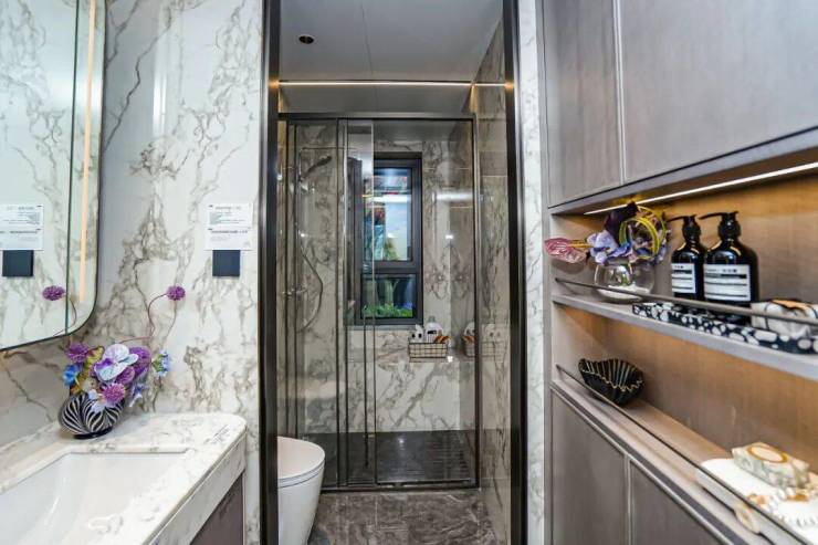 次卫的S墙则安排在了干湿分离的干区,算上台盆上面的收纳柜足以放下各类洗护用品。而且次卫台盆下方还预留了扫地机器人上下水。