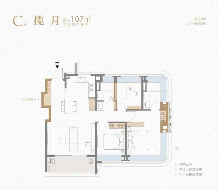 ②建面约107㎡3房2厅2卫户型: