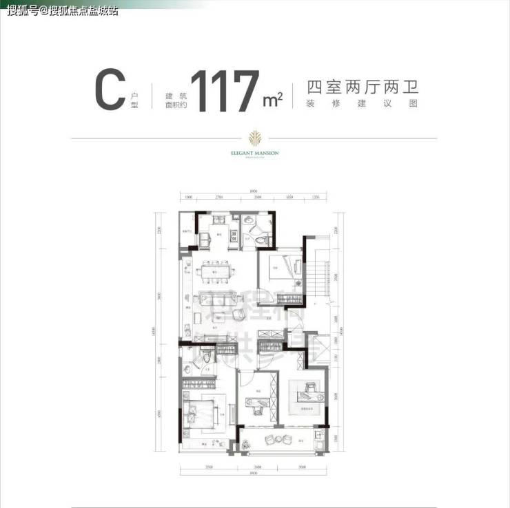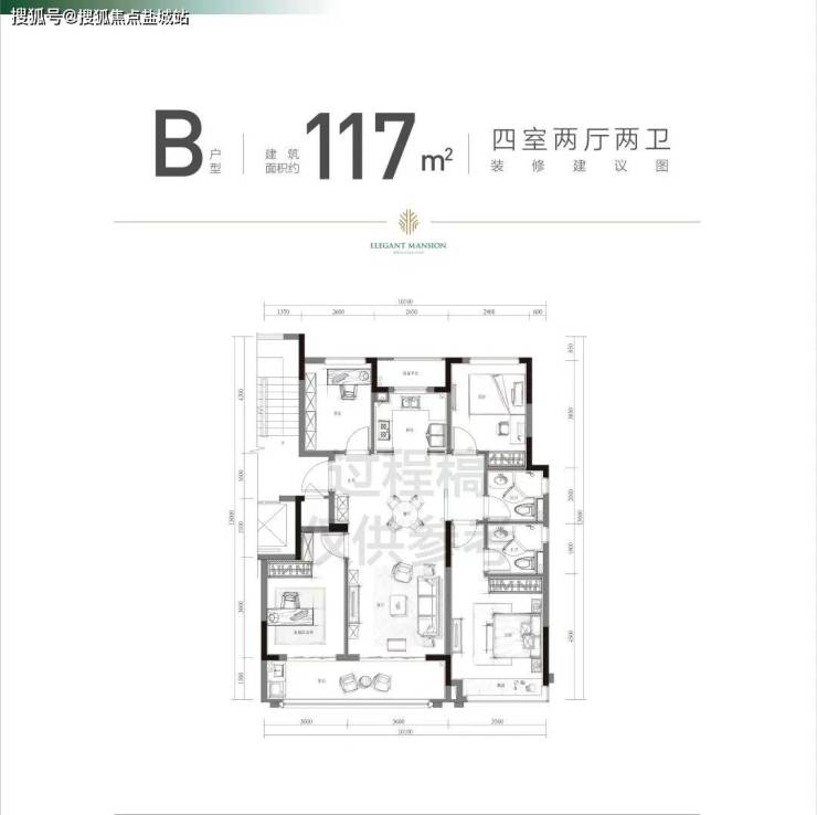 117㎡边套为四室两厅两卫,三开间朝南+南向双开间阳台。在洋房得房率的加持下,套内面积比肩高层建面约130㎡户型。