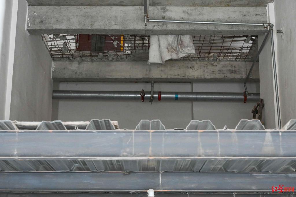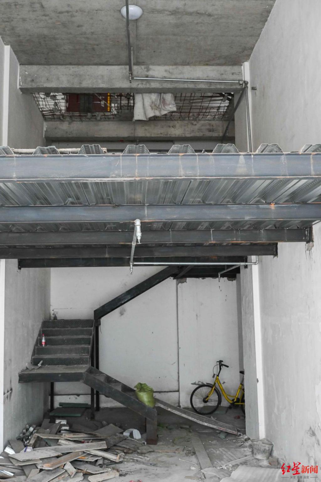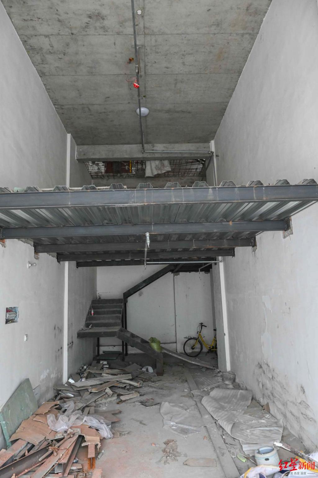 由于当日该名业主不在家,记者未能进入其家中查看,但记者从一楼商铺的门缝中看到,商铺内堆满建渣,屋内已被隔断成两层,最里面有一条通向二层的楼梯,而再往上,记者可以清晰看到,一楼商铺与二楼住宅间的楼板被凿通,只留有交错的钢筋结构。以楼上、楼下被凿穿的部位进行对比,基本确定破坏位置位于此处。