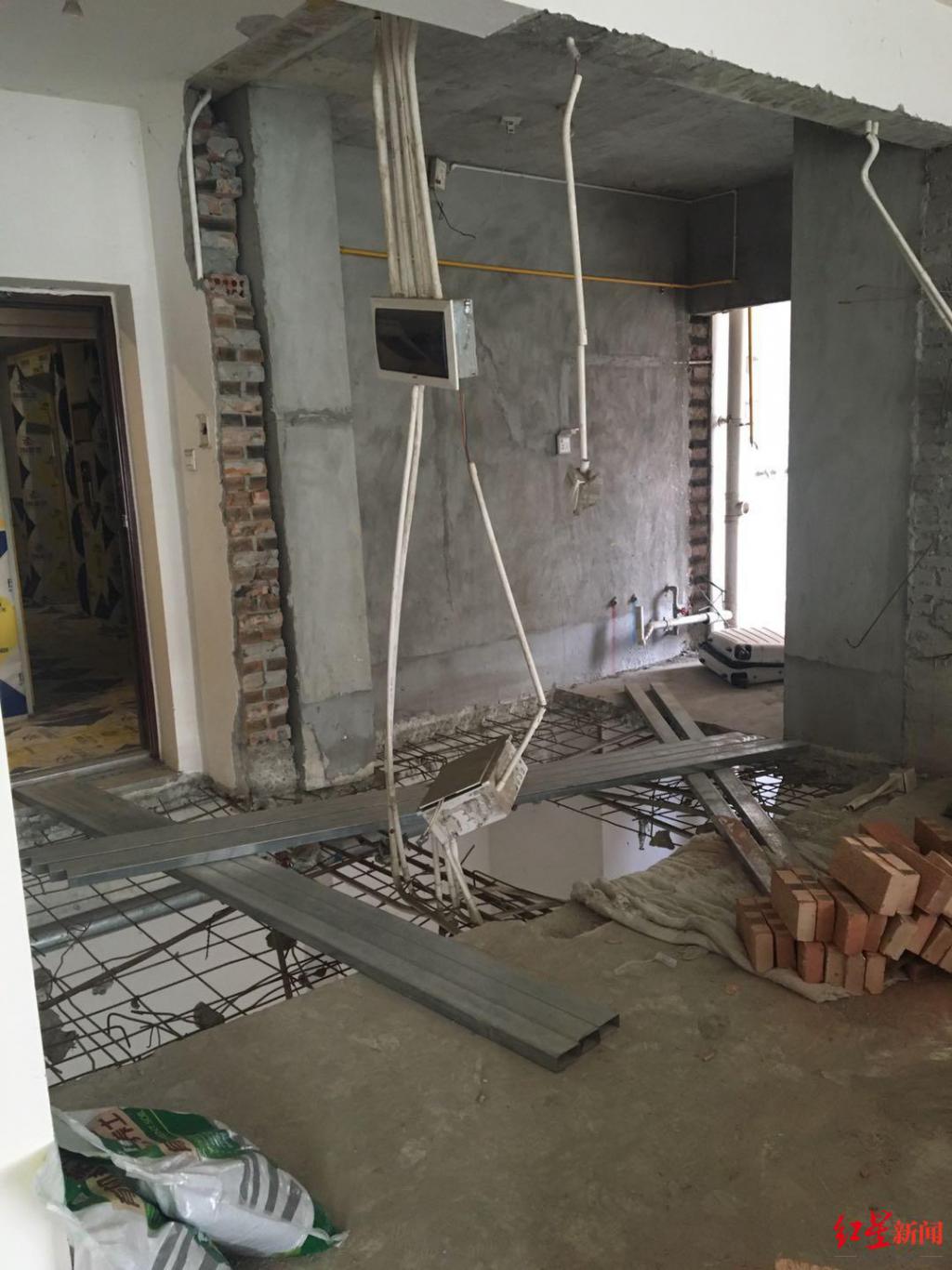 从小区业主发来的现场照片中,记者看到,一楼与二楼间的楼板,有至少数平米的水泥地面被打穿,被打穿的地面钢筋裸露,部分地方,连钢筋也被剪断。