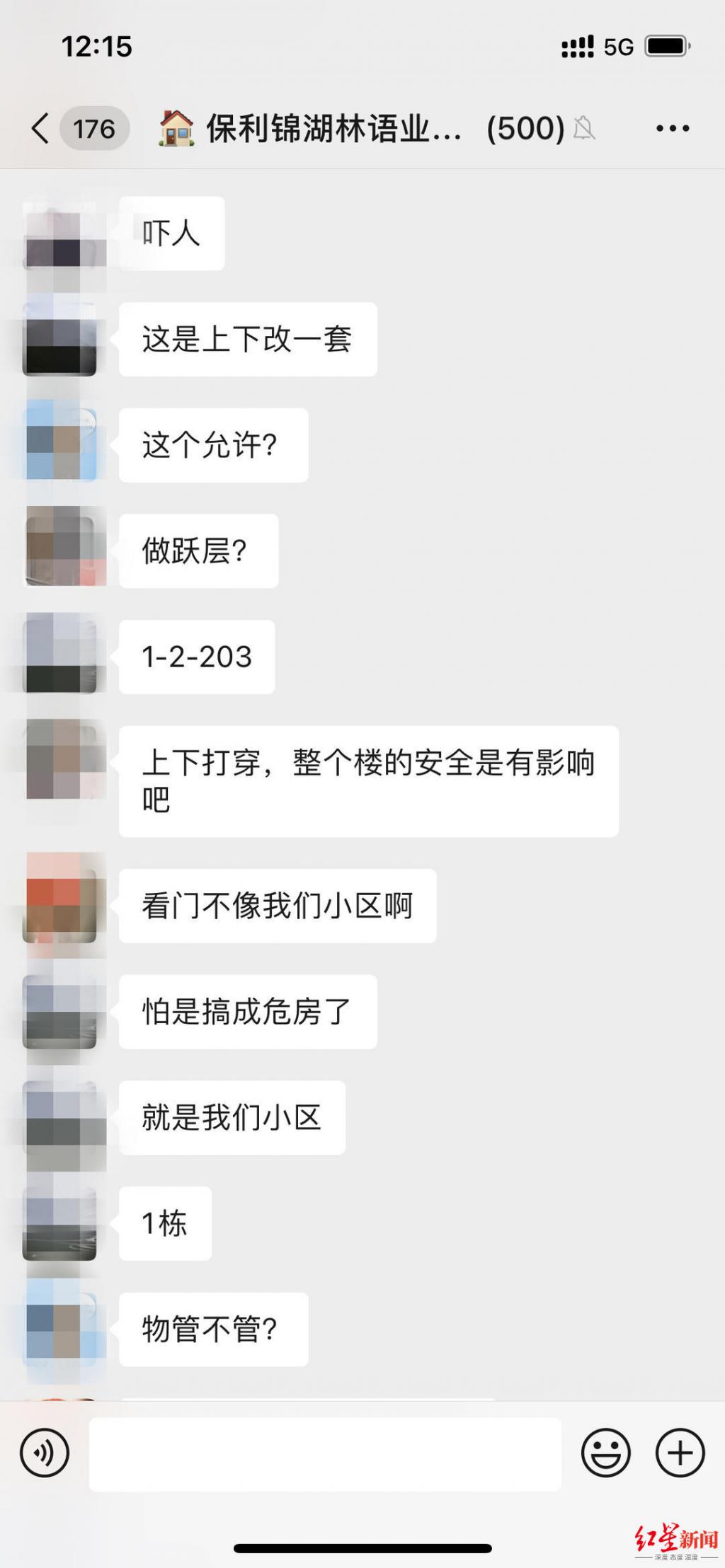 " 我们小区有个业主,默默买了一栋楼的第 2 层住宅和 1 楼商铺,然后自己把楼板全部打通了…… " 近日,成都保利锦湖林语小区业主群因一业主打穿楼板的事炸开了锅,看着发来的现场照片,楼板的钢筋裸露,业主们担心不已。