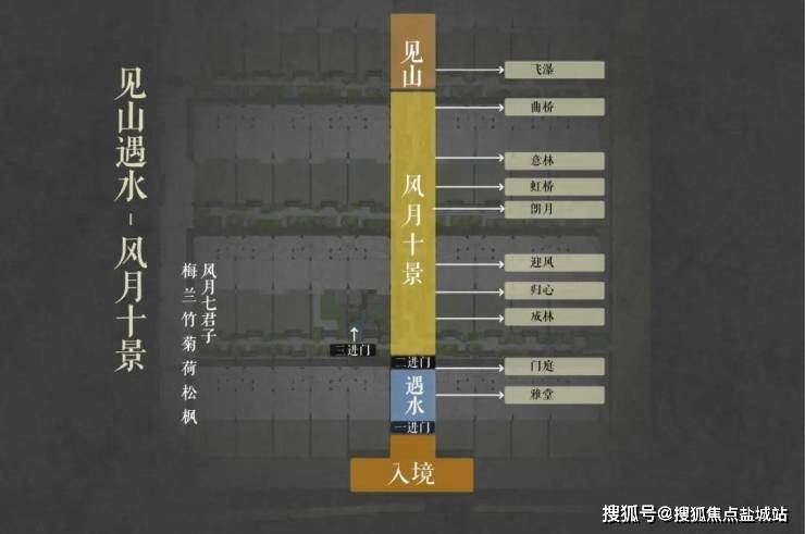 中国人自古讲究归家礼序,门第之尊;久映颂月将传统中式建筑的礼序空间融入整体的规划布局中,形成一坊八巷-置坊入巷-穿巷入户的三重归家礼序。