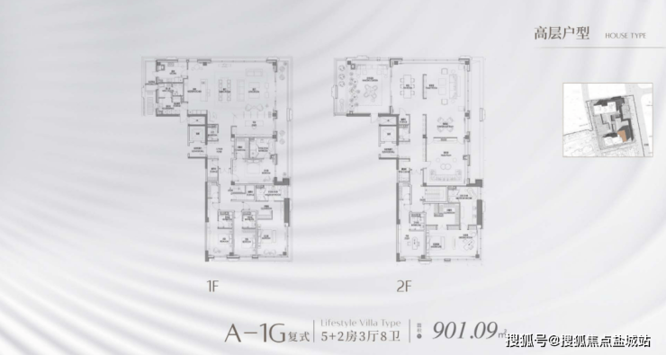 西边套是建面约370㎡左右的户型,中间套是建面约263-290㎡户型,东边套则是建面约490㎡左右的户型。3号楼还有两套顶复,建面约862-849㎡。