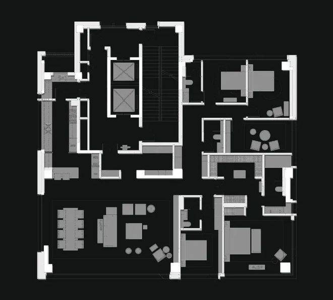 在310㎡户型里,几乎每个家庭成员都能拥有私密的天地。整个空间做到了“4+1”房,南向双套房,最大的套间足有57个平方,相当于把安缦酒店的行政套房搬到了家里。