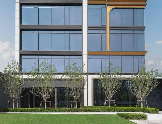 铝板、大面积玻璃与金属框线组成了璞云东方的“第一眼心动”,尤其是工艺精巧又极为吸睛的R角金属线框,犹如一道金色飞虹,让人一眼难忘。