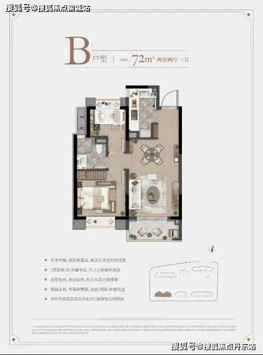 B户型 建面约72㎡两室两厅一卫▼