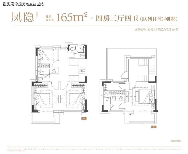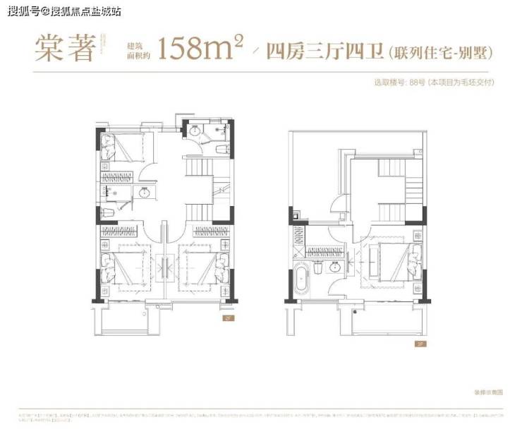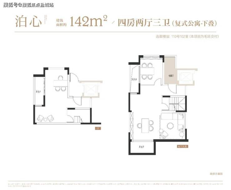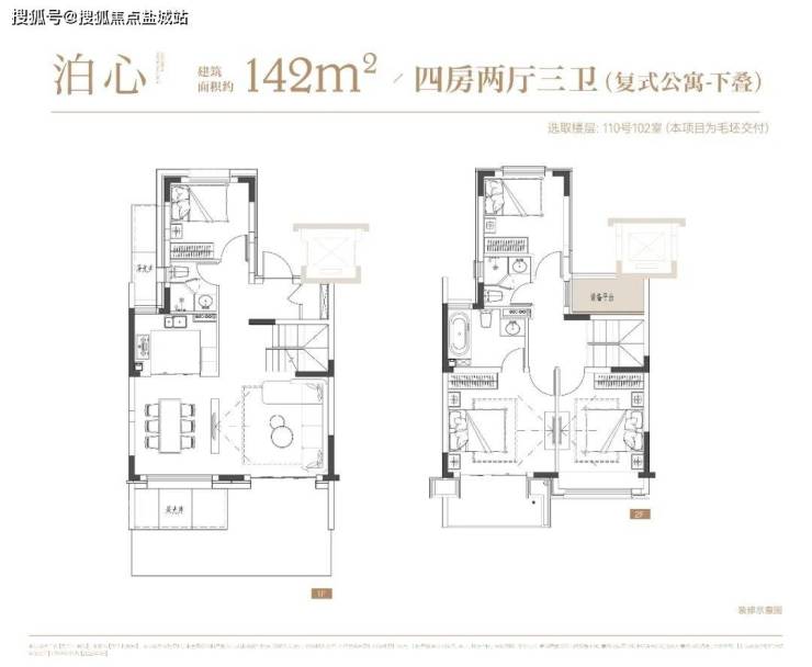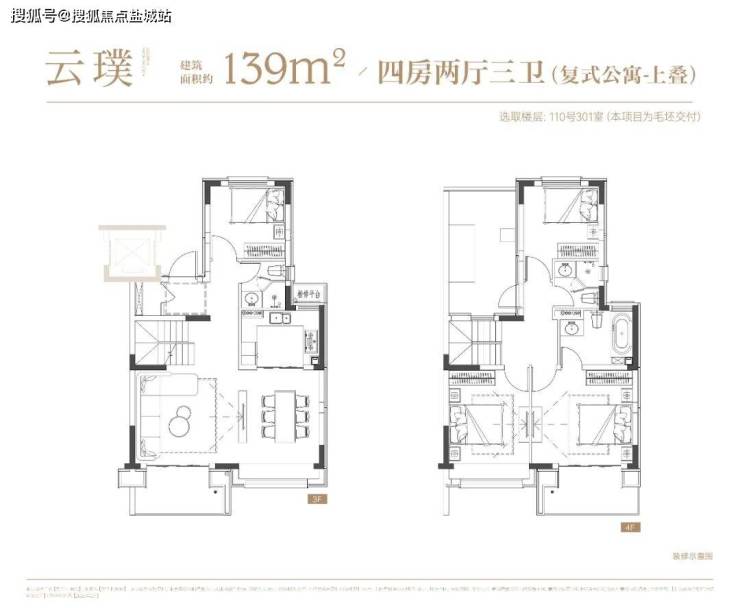 4层叠墅分为上/下叠,上叠建筑面积约139㎡,下叠建筑面积约142㎡,均为4房设计。