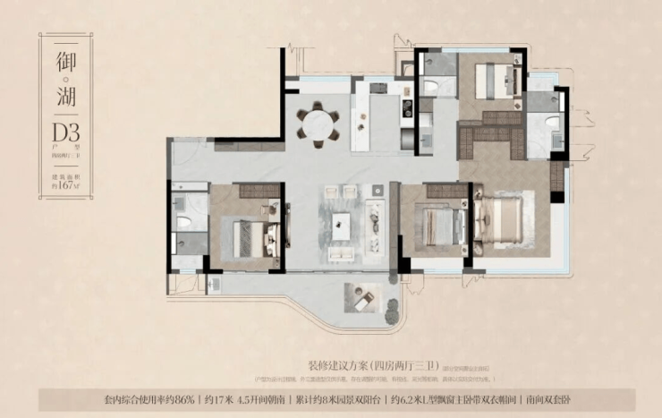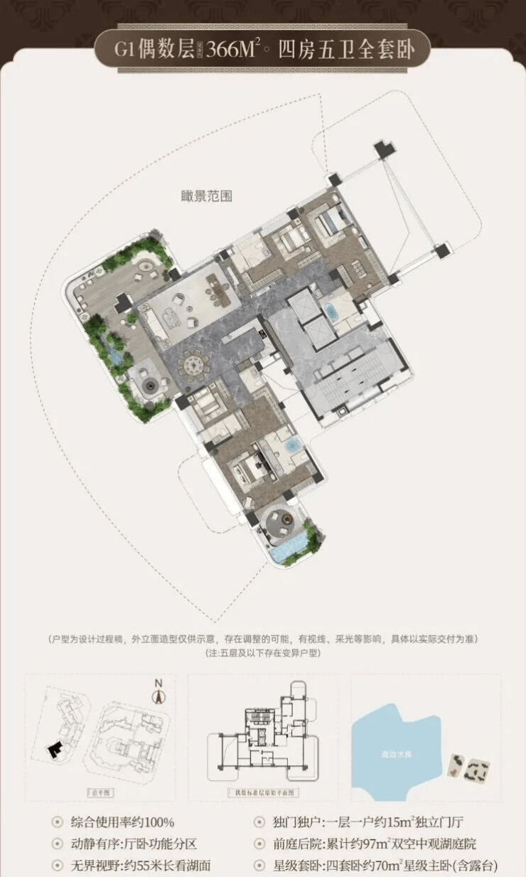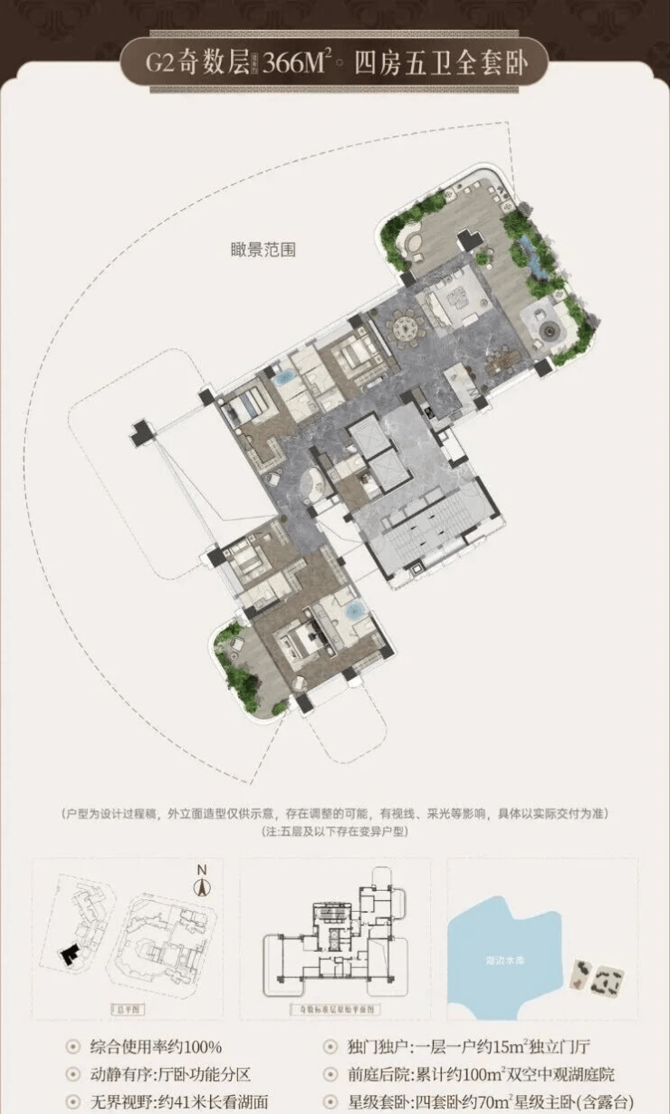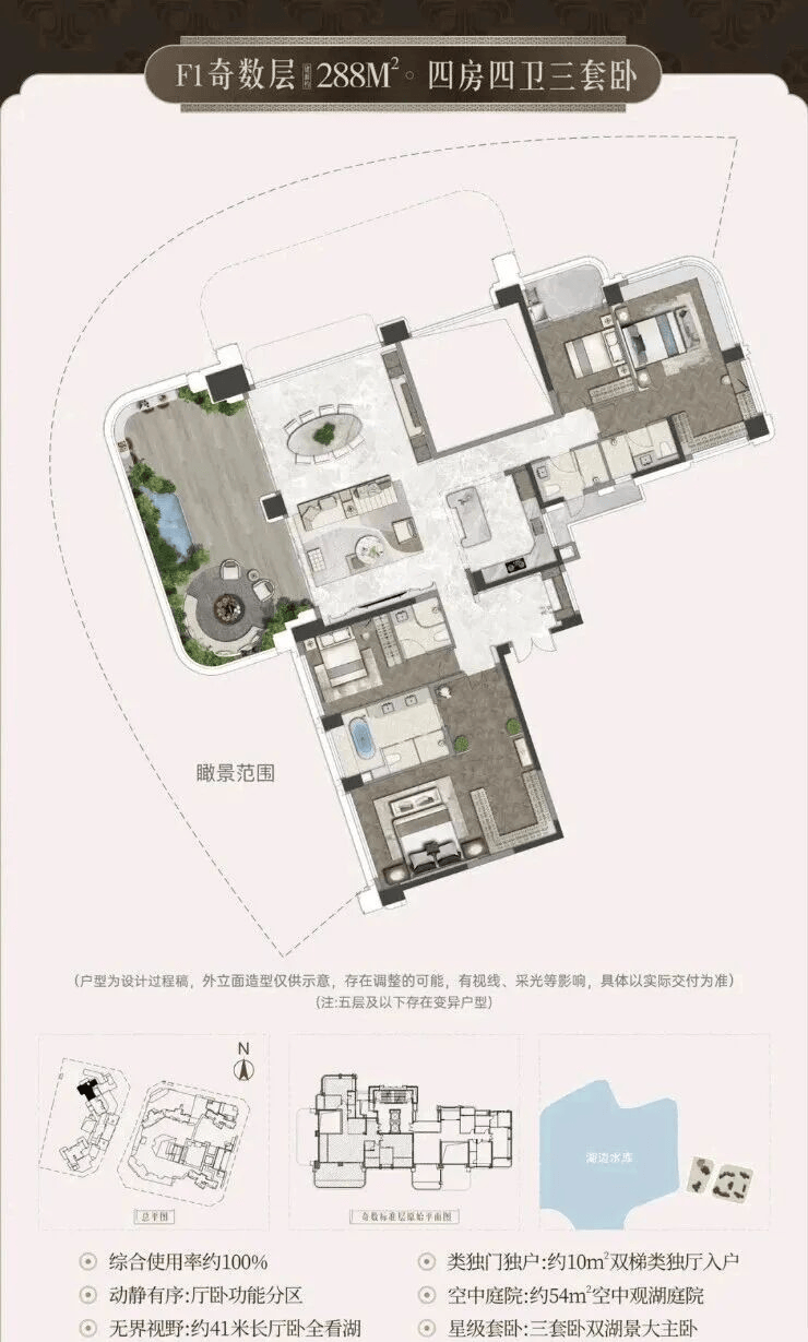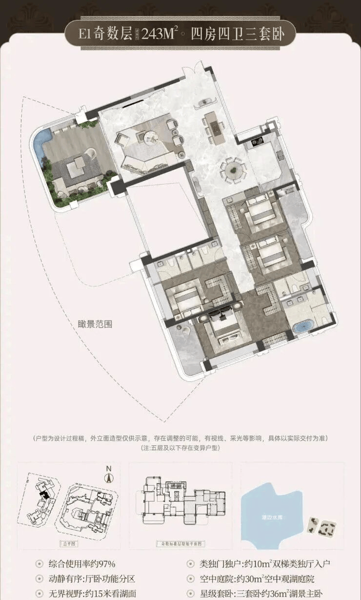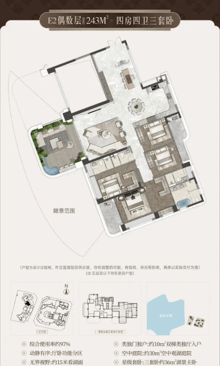 •宸启瑞湖主力户型有 244平 289平 366平等4室布局;